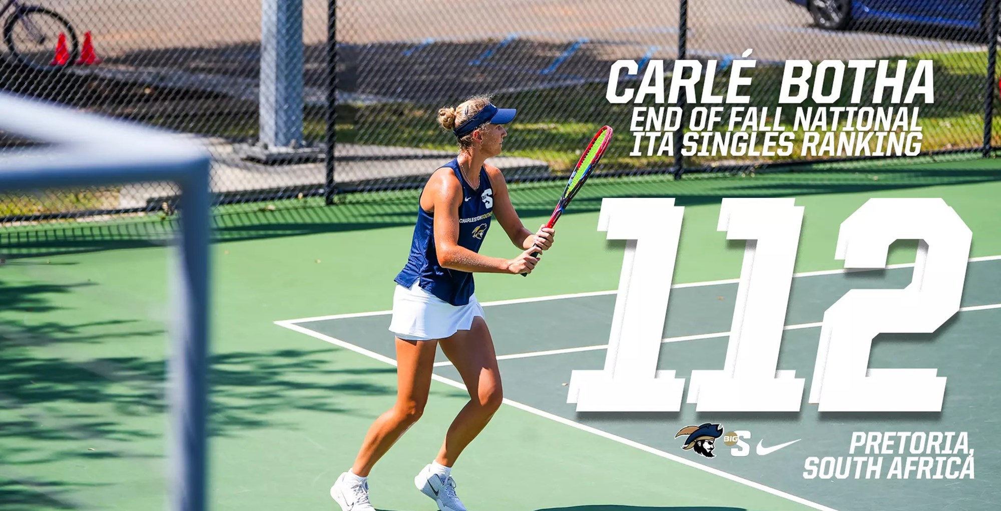 CHARLESTON, S.C. - Charleston Southern University's women's tennis standout Carlé Botha has achieved a remarkable milestone, earning a national singles ranking of No. 112 in the latest Intercollegiate Tennis Association (ITA) rankings. Botha stands out as the only player from the Big South Conference to receive this honor, underscoring her exceptional talent and strong performances against top competition. This recognition highlights Botha's hard work and dedication as she continues to raise the profile of Charleston Southern tennis on the national stage in just her first season of collegiate tennis.