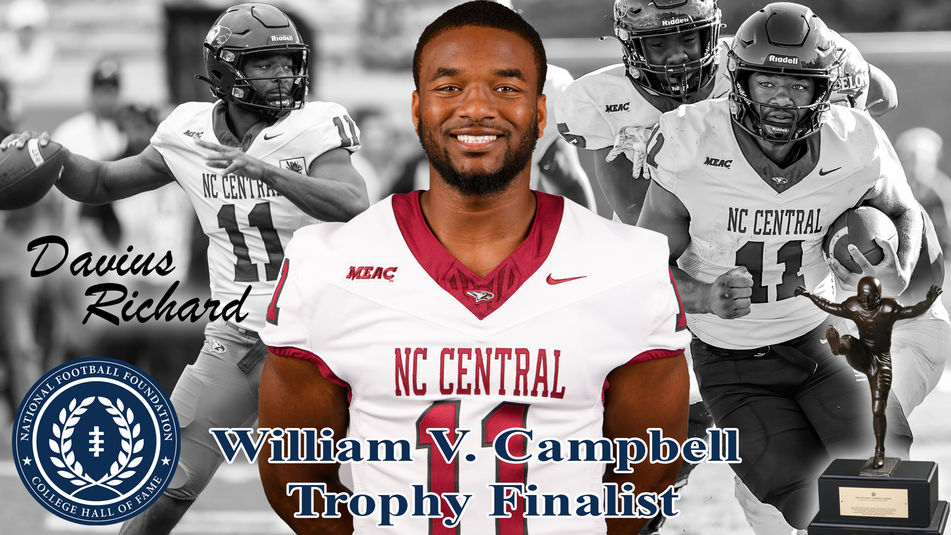 IRVING, Texas – North Carolina Central University senior quarterback Davius Richard has been announced by the National Football Foundation (NFF) & College Hall of Fame as one of 16 finalists for the 2023 William V. Campbell Trophy®, college football's premier scholar-athlete award that annually recognizes an individual as the absolute best in the nation for his combined academic success, football performance and exemplary leadership.