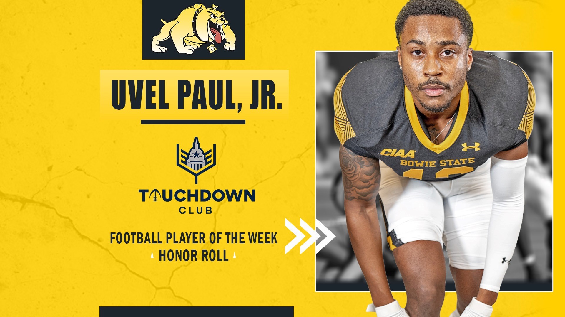 BOWIE, MD -- Bowie State's linebacker Uvel Paul, Jr. has been named one of this week's DC Touchdown Club Washington Metro College Football Player of the Week Honor Roll recipient Tuesday.
